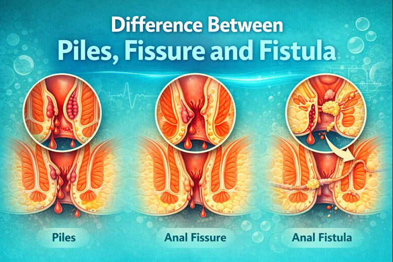 Difference Between Piles, Fissure and Fistula Gastroenterology These three conditions are often confused but are very different. Piles Swollen veins causing bleeding and discomfort. Fissure A painful tear causing severe pain during stools. Fistula An abnormal tunnel between the anus and skin, often with discharge. Why Correct Diagnosis Matters Treatment varies significantly for each condition. Dr Nikhil Nanjappa offers accurate diagnosis and targeted treatment for all anorectal conditions in Mysore.